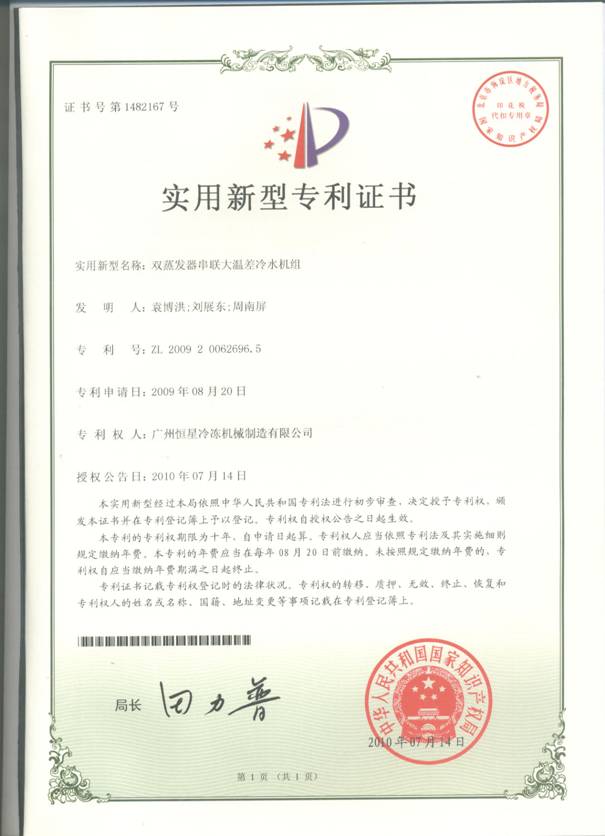 附:雙蒸發(fā)器串聯(lián)大溫差冷水機(jī)組專利證書: